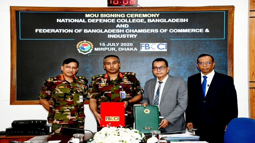 National Defence College (NDC) and the Federation of Bangladesh Chambers of Commerce and Industry (FBCCI) signed a Memorandum of Understanding (MoU) to establish a strategic cooperation framework between NDC and FBCCI in knowledge exchange, research collaboration, and joint advocacy to support national development. The MoU was signed on July 15, 2025 at the NDC office in Mirpur, Dhaka.